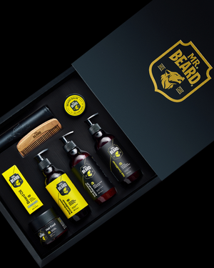 Mr. Beard grooming product set with bottles, a comb, and a jar in a black box.