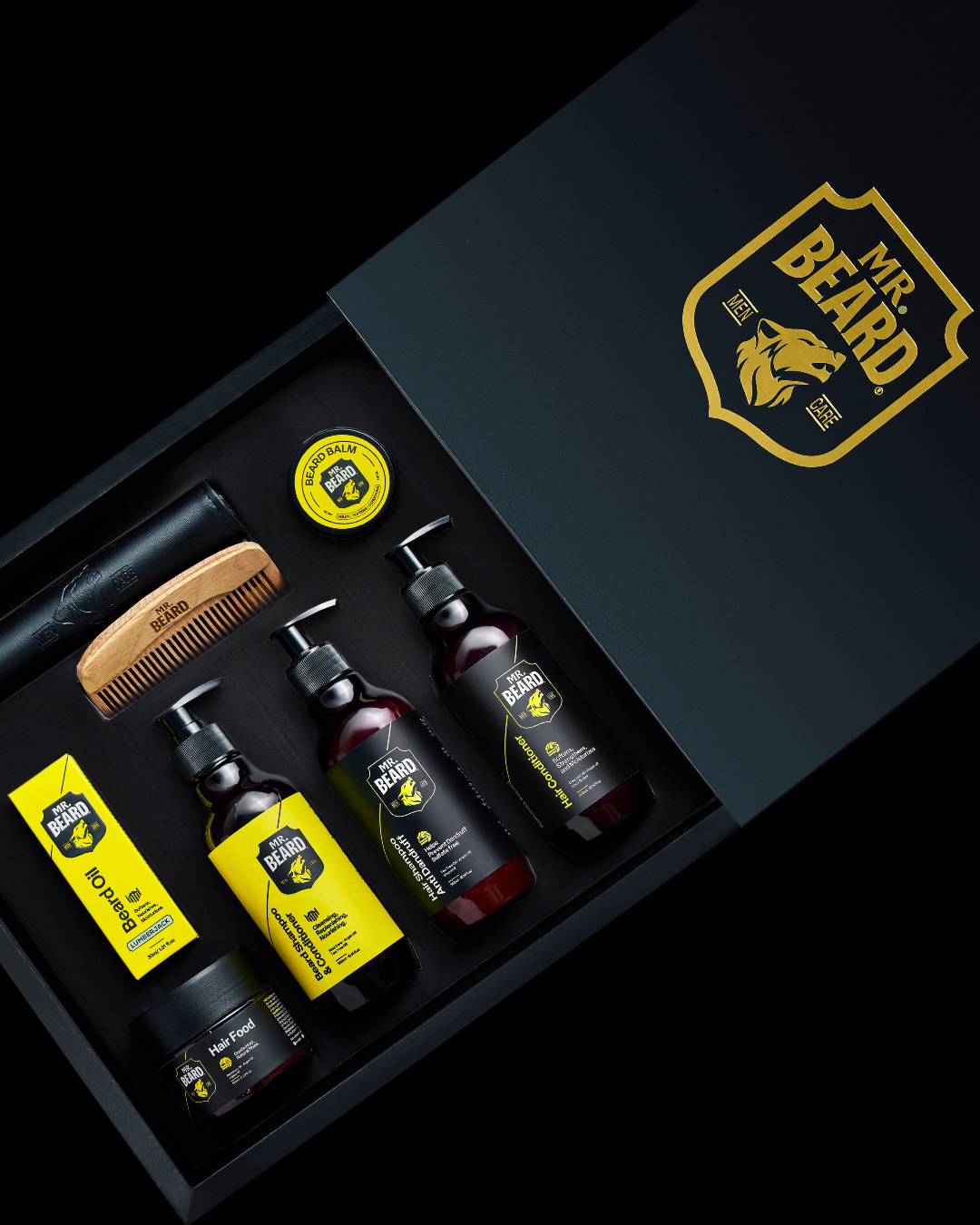 Mr. Beard grooming products including a comb, bottles, and a box with the brand logo.
