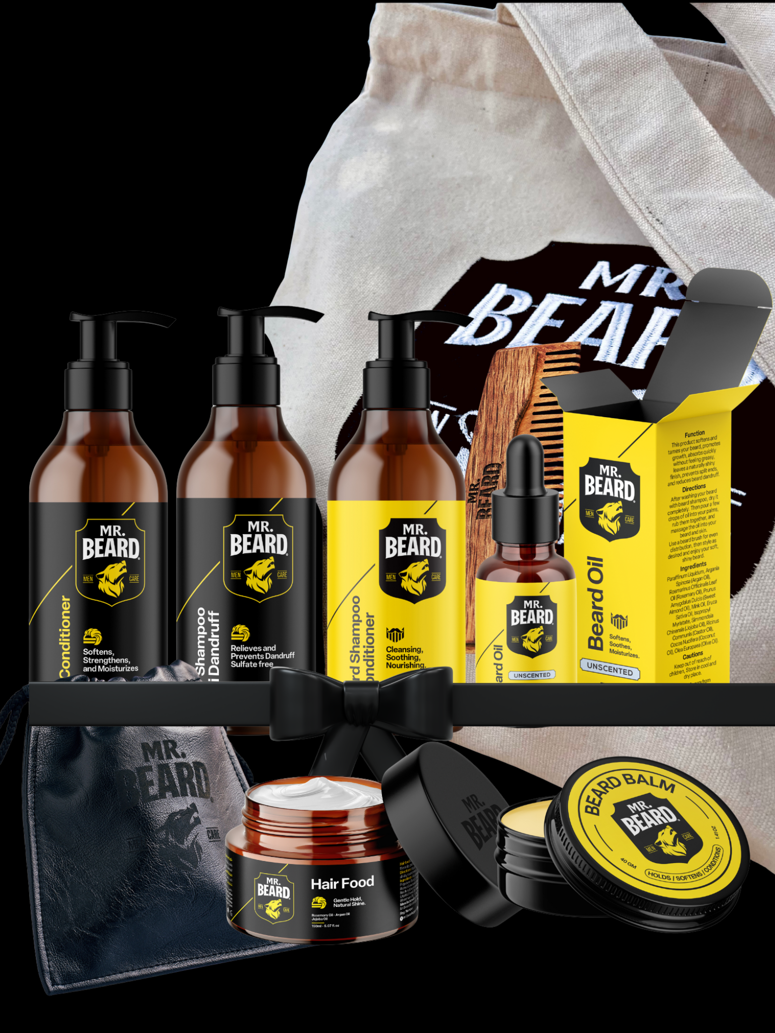 The Mr. Beard Mega Grooming Bundle brings together every essential you need to keep your beard sharp, your hair strong, and your style on point — complete with a premium leather travel pouch and a stylish linen summer tote bag for effortless everyday carry.