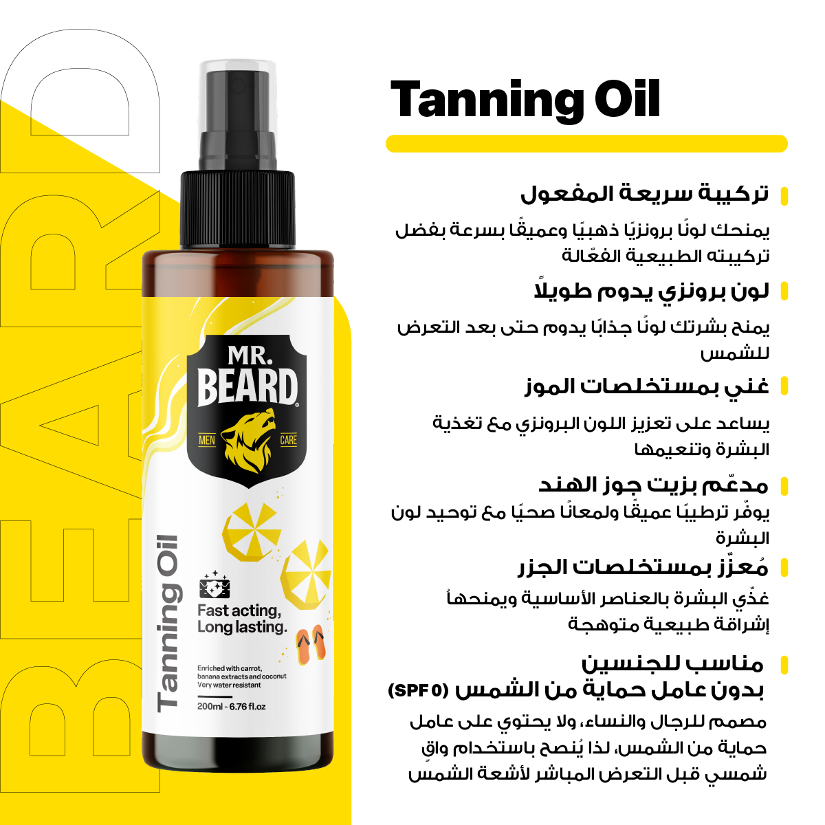 A bottle of Mr. Beard tanning oil with a spray nozzle, featuring a label with the brand name and product details.